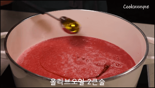 2) 블렌더에 간 토마토를 냄비에 모두 붓고, 소금 2~3꼬집을 뿌리고 올리브오일 2큰술을 넣은 뒤 끓여줍니다. 끓기 시작하면 중간불로 줄이고 바닥에 눋지않도록 잘 저어가며 끓여줍니다. 끓이는 시간은 15분입니다. 토마토의 라이코펜 성분은 15분을 끓였을 때 가장 많이 증가한다고 합니다.
