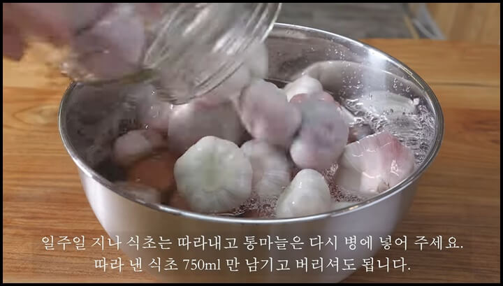 일주일이 지나서 식초를 모두 따라내고, 통마늘은 건져서 다시 병에 담아줍니다. 따라 낸 식초는 750ml만 남기고 버려도 됩니다.