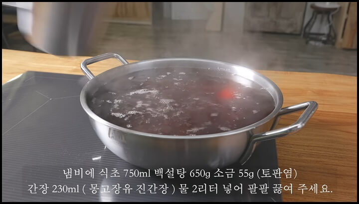 냄비에 식초 750ml, 백설탕 650g, 소금 55g(토판염), 간장 230ml(몽고장유 진간장), 물 2리터를 넣고 팔팔 끓여줍니다.