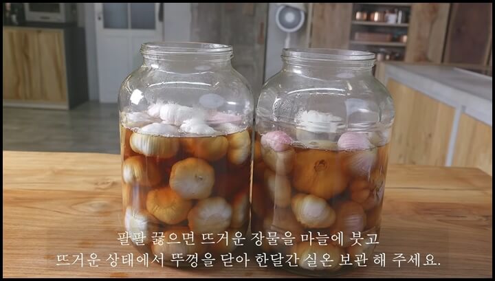 뚜껑을 잘 닫아 한달간 실온에 보관하는데요, 검정 비닐로 빛을 차단해주어야 합니다. 그래야 마늘의 녹변 현상을 방지해 줍니다.