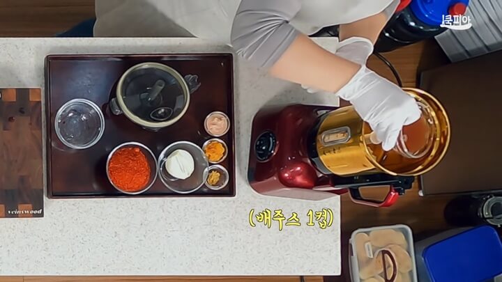 절임물 1컵을 믹서기에 넣습니다. 찬밥 1/2 공기, 배즙 1컵을 함께 믹서에 넣어줍니다. 배즙은 갈아 만든 배 주스 말고 배즙으로 먹는 그것 아시죠? 그 배즙 1컵을 넣어주면 됩니다. 만약 배즙이 없다면 사과 1개를 껍질과 씨 제거 후 같이 넣어도 됩니다.