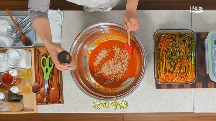 양념을 다 바르고 나면 조금 남은 양념이 있는데요, 쪽파는 물이 생기지 않는 김치이기 때문에 약간 물을 만들어 주는 것이