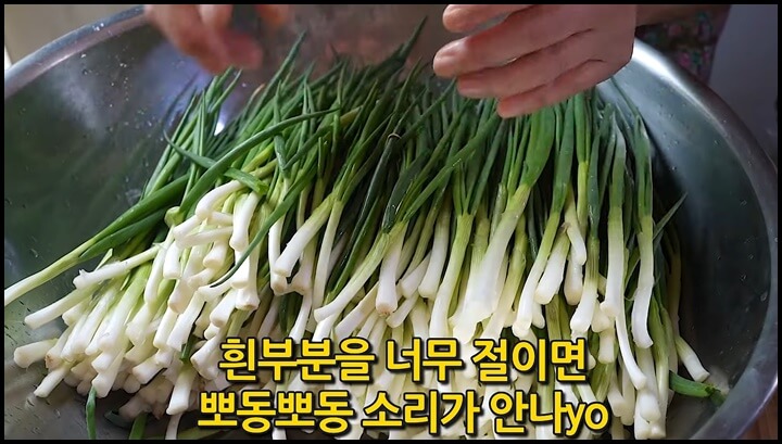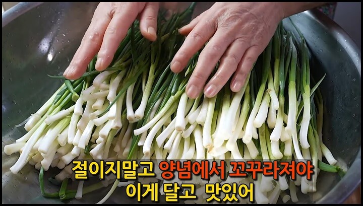 파는 미리 절이지 않는 것이 좋은데요, 미리 간을 해서 절이게 되면 숨이 죽으면서 질겨질 수 있습니다. 그러니 양념해서 숨이 죽어야 달고 맛있으며, 흰 부분도 씹었을 때 뽀동뽀동 소리가 나면서 씹는 식감도 살아있습니다.