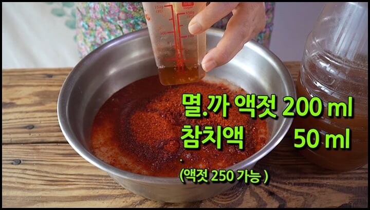 그리고 멸치액젓 또는 까나리액젓을 200ml 넣어줍니다. 풍미를 더해주기 위해 참치액 50ml를 넣어줍니다. 참치액이 없으면 액젓만 넣어도 됩니다.