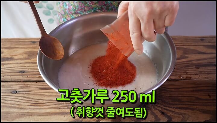 갈아준 것을 그릇에 담고, 고춧가루 250ml를 넣어줍니다. 고춧가루 양은 취향껏 줄여도 상관없습니다.