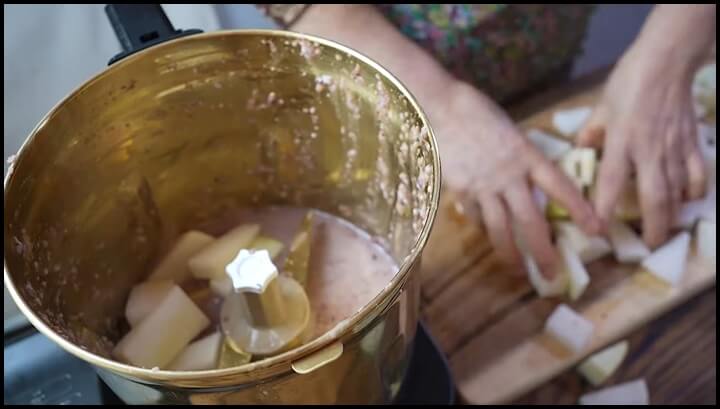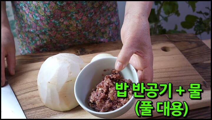 믹서기에 밥 반공기와 물 반컵을 넣고 갈아준 후 무와 양파를 썰어 넣고 갈아줍니다.