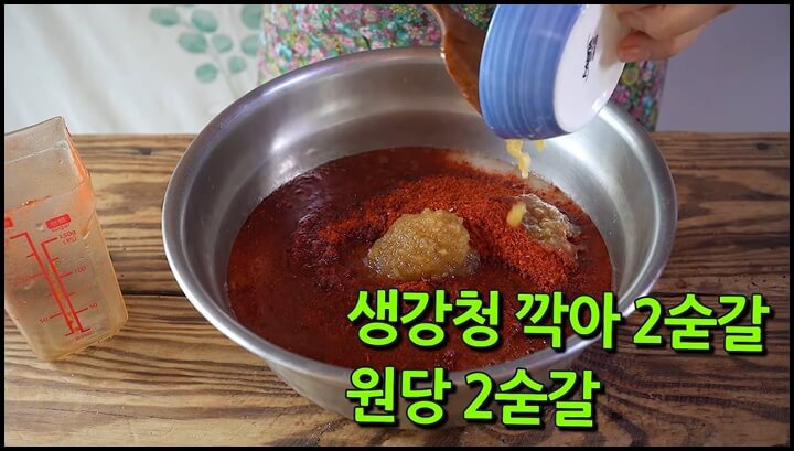 간 마늘은 전혀 들어가지 않고, 생강청이나 생강 간 것을 2 숟갈 넣어줍니다. 원당도 2숟갈 넣어줍니다. 파는 매운맛이 강하기 때문에 양념을 약간 달큰하게 해야 합니다.