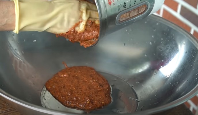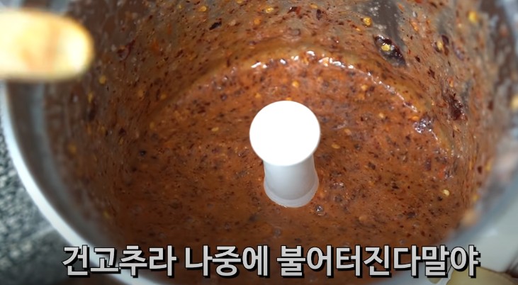 건고추를 사용할 때는 잘라서 미리 물에 불려두면 믹서기에 넣고 갈 때 더 잘 갈려요. 믹서기에 갈은 재료를 큰 그릇에 부어줍니다.