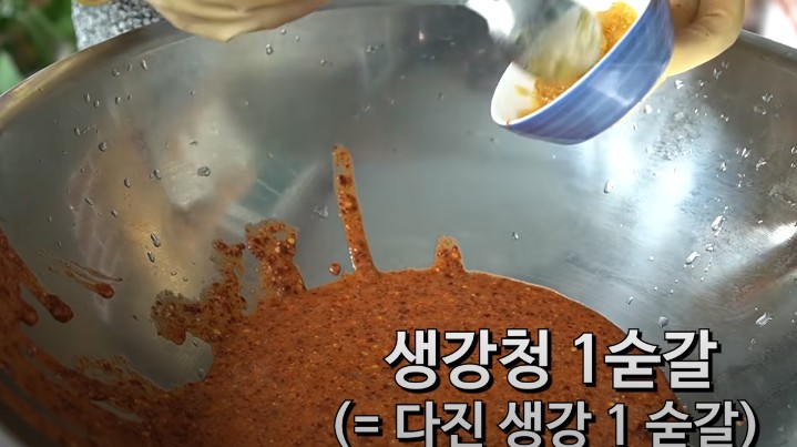 여기에 생강청 1 숟갈을 넣어주고, 진간장 50ml와 멸치 진젓 150ml(또는 액젓 150ml)를 같이 넣어줍니다. 조청 또는 물엿 100ml와 매실청 50ml, 고춧가루 300ml, 원당 2 숟갈, 깨 2 숟갈을 넣고 잘 섞어주어요.