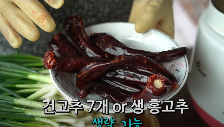 믹서기에 밥 반공기, 물 150ml를 넣고 갈은 다음 건고추 7개 또는 생 홍고추 7개를 넣고 같이 갈아줍니다. 고춧가루만 넣는 것보다 건고추나 생 홍고추를 같이 넣어주면 파김치의 색이 훨씬 살아있고 고우며, 맛도 더 좋아진답니다. 그러나 만약 없다면 생략해도 괜찮아요.
