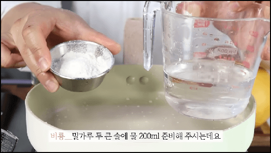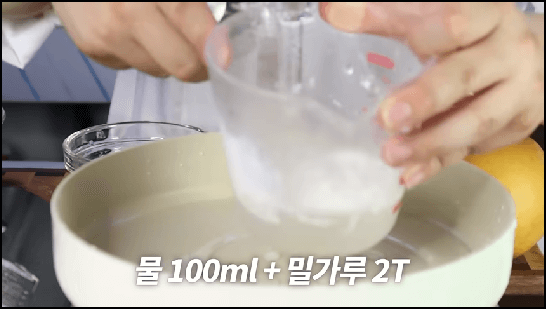 밀가루 2스푼과 물 200ml를 준비하면 되고, 냄비에 물 100ml만 먼저 부어줍니다. 그런 다음 남은 물 100ml에 밀가루 2스푼을 넣어서 잘 풀어줍니다. 물이 보글보글 끓으면 밀가루 푼 물을 넣어서 저어가며 끓여줍니다. 가운데가 보글보글 끓으면 불을 끄고 한김 식혀줍니다.
