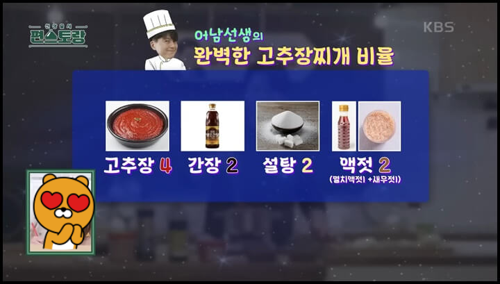어남선생 류수영 고추장찌개 양념 황금비율은 고추장 4 : 간장 2 : 설탕 2 : 액젓 2(멸치액젓 1 + 새우젓 1) 입니다.