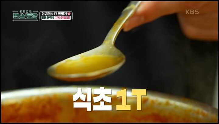 총 20분을 다 끓인 후 마지막 화룡점정! 식초 1스푼을 넣어줍니다. 식초를 넣어주면 산미가 올라가면서 맛이 잡힙니다. 전혀 시지 않으니 염려안하셔도 됩니다.