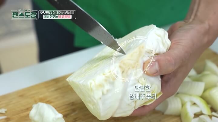 양파는 쑹덩쑹덩 한 입 크기로 썰어줍니다. 양배추는 반으로 갈라 양배추 심지를 잘라내줍니다. 그리고 큼직하게 썰어줍니다.