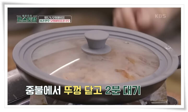 뚜껑 닫고 중불에서 2분 정도 쪄 줍니다. 2분 뒤에 뚜껑을 열어보면 물이 나와서 국물이 생겨 있는데요, 마지막으로 불을 강불로 올려서 졸여가며 볶아서 불맛을 입혀줍니다.