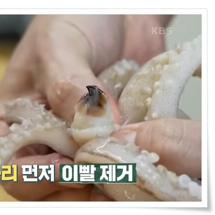오징어 다리에는 손톱 같은 빨판이 있으니 손으로 쭉쭉 눌러가며 긁어내어 빨판을 제거해 줍니다.