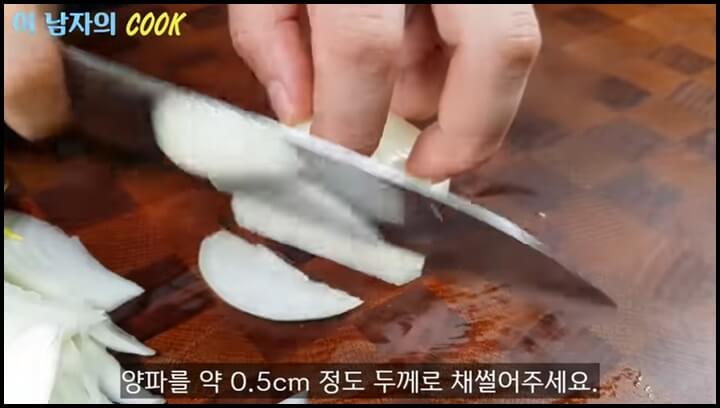5) 양파도 1개 준비해서 0.5cm 정도의 두께로 채 썰어줍니다.
