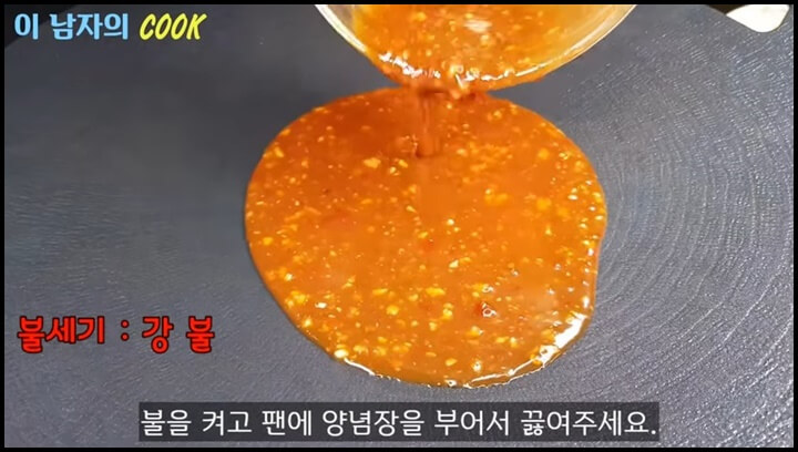 1) 아무것도 두르지 않은 팬에 양념장을 모두 넣고 끓여줍니다.
