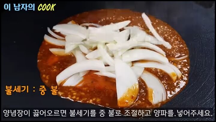 2) 양념장이 바글바글 끓어오르면 불을 중불로 낮추고 채 썬 양파를 넣어줍니다.
