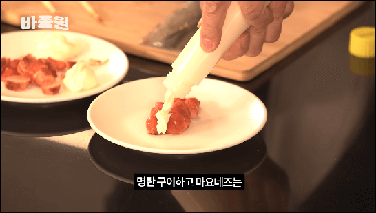 명란젓을 뒤집을 필요없이 계란 반숙 굽듯이 아랫면만 구워주면 더 고급져 보입니다. 한쪽 면만 노릇노릇하게 구운 뒤 먹기 좋은 크기로 잘라줍니다. 완전히 익으면 예쁘게 안잘라집니다. 자른 명란젓을 접시에 올려주고, 마요네즈를 뿌려줍니다. 명란젓과 마요네즈는 아주 잘어울리니 명란구이 드실 때 마요네즈는 꼭 필수입니다.
