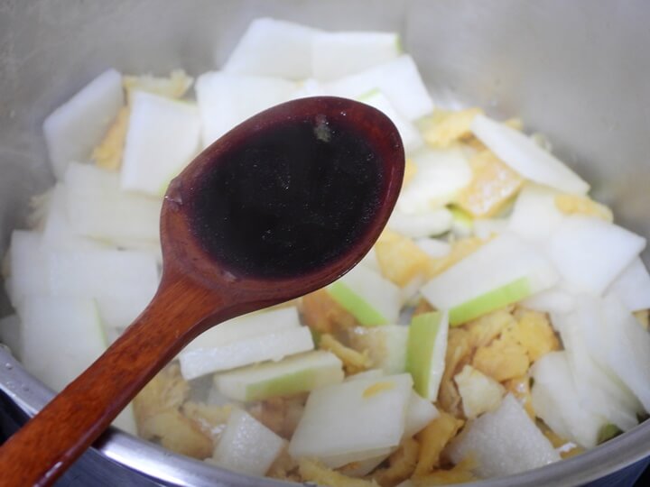 황태와 무를 볶으면서 액젓 1숟갈, 국간장 1숟갈을 넣어 밑간을 하며 볶습니다. 이렇게 볶을 때 미리 밑간을 하면 황태와 무에 간이 배어서 더 맛있어진다고 해요. 하지만 밑간하지 않아도 사실 맛의 큰 차이는 없더라구요:)