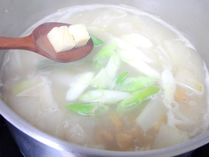 두부도 마지막에 넣어주면 더 담백하면서 뽀얗게 국물이 우러나 더욱 맛있어요. 한소끔 끓이면 완성입니다.