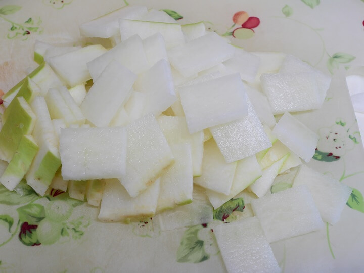 무 한 조각은 먹기 좋은 크기로 네모나게 썰어줍니다. 무도 역시 국물과 함께 한 입에 쏘옥 넣기 좋게 작은 크기로 썰어주어요. 황태국에 무가 들어가면 국물이 훨씬 시원하고 맛있어요.