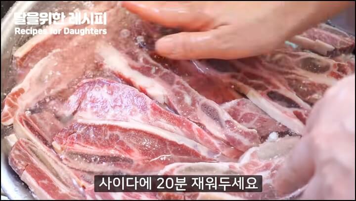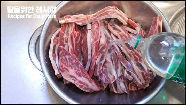 la갈비 핏물을 뺀다고 물에 오래 담가두면 맛있는 맛이 다 빠져나가게 됩니다. 빠르고 맛있게 핏물 빼는 방법을 알려드리면 바로 사이다를 이용하는 것입니다. 사이다를 부어서 20분 정도 담가 둡니다.