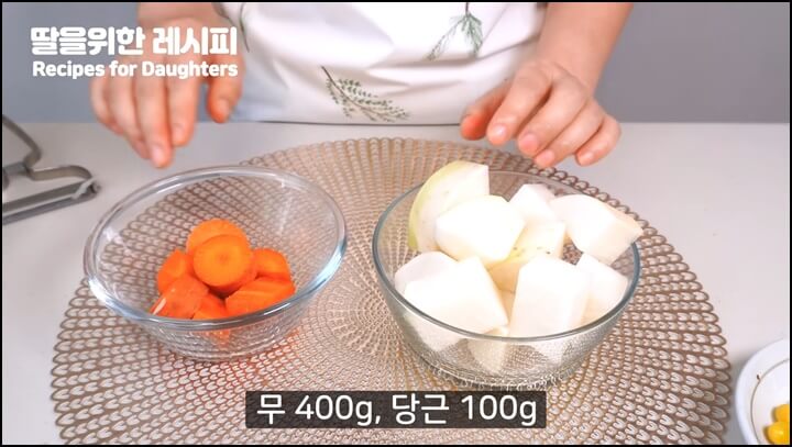 무와 당근은 적당한 크기로 잘라서 모서리를 잘라내어 둥글게 만들어 준비합니다.