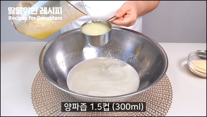 정확한 계량을 위해 계량컵과 계량 스푼을 사용하는 것이 좋겠습니다. 배즙 2컵을 넣고, 양파즙 1.5컵을 넣어줍니다. 과일 건더기가 들어가면 갈비찜이 깔끔하지 않기 때문에 착즙기나 베 보자기를 이용해 즙을 내어 넣어주는 것이 좋습니다.