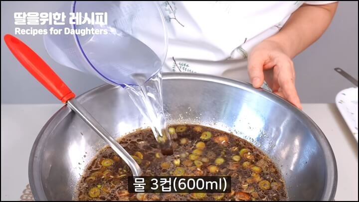 la갈비찜이기 때문에 조릴 때 짜게 될 수 있으니 여기에 물 3컵을 더 추가해 줍니다. 설탕이 녹을 수 있도록 잘 저어줍니다.
