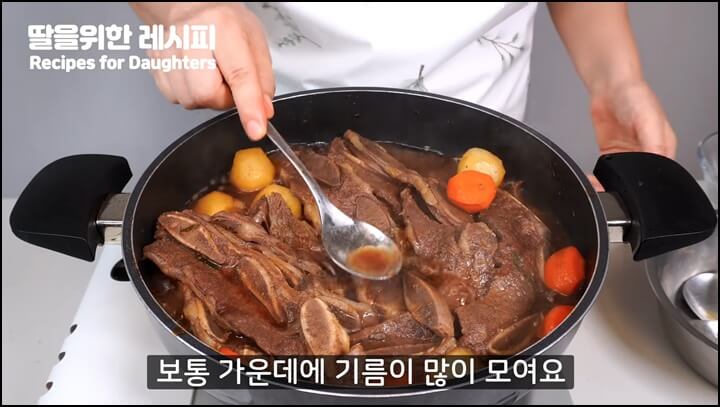 15분 정도 끓인 후 뚜껑을 열면 la갈비가 푹 잘익었고, 가운데에 기름이 많이 모이니 기름은 한번 더 걷어줍니다. 기름을 걷어내야 밥 비벼먹기가 좋습니다.