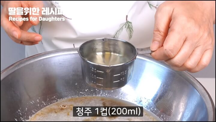 청주 1컵을 넣어주는데, 청주는 청하, 백하수복 등의 술입니다. 맛술을 넣으면 단맛이 나기 때문에 이 레시피와 맛이 달라질 수 있으니 청주를 사용하는 것을 권해 드립니다.