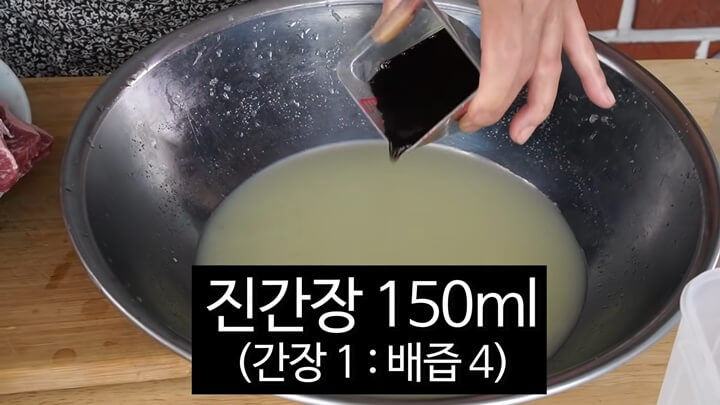 여기에 진간장 150ml를 넣어줍니다. 간장과 배즙의 비율은 1:4 정도로 맞추는 것이 좋겠습니다.