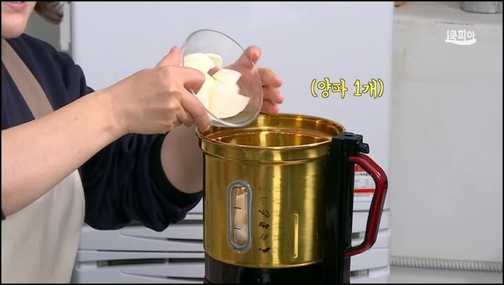 양파 1개, 마늘 10쪽, 청양고추 2개를 믹서에 넣어줍니다. 청양고추를 넣어주면 고기의 잡내 등을 없애는 데 좋고, 매운맛이 그리 강하지 않습니다. 하지만 아이들이 먹을 거라면 청양고추는 생략해도 좋습니다.