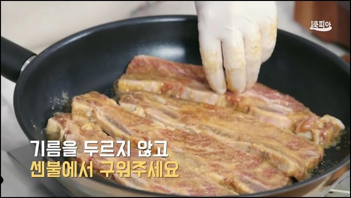 양념에 버무린 la갈비를 따로 재지 않고 그대로 팬에 올려서 구워줍니다. 팬을 달군 후에 기름을 두르지 않고 센불에서 구워주면 됩니다.