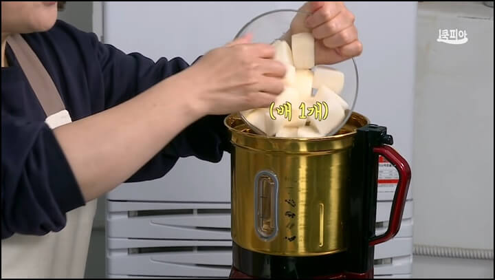 배 1개를 믹서에 넣어주는데, 만약 배가 없다면 배즙 1봉지도 괜찮고, 사과즙도 괜찮습니다. 그러나 사과즙은 보관할 시 약간 새콤한 맛이 날 수 있으니 되도록이면 배즙이나 배가 좋습니다. 만약 배, 배즙, 사과 등 그 어느 것도 없을 경우엔 시판 캔 식혜를 넣어주어도 좋습니다.
