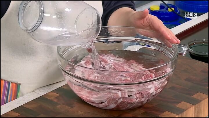 la갈비는 1cm 두께로 길게 슬라이스한 구이용으로 2kg 정도 준비합니다. la갈비는 기계로 썰기 때문에 뼛가루가 묻어있을 수 있으니 물에 담가서 흐르는 물에 뼛가루가 씻어지도록 손으로 비벼가며 씻어줍니다.