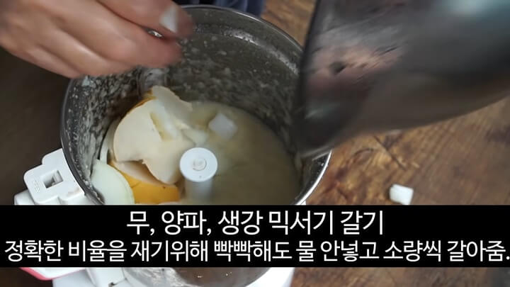 생강 2톨도 작게 썰어서 믹서에 같이 넣고 갈아줍니다. 약간 뻑뻑하더라도 물을 넣지 말고 소량씩 넣어서 갈아줍니다.