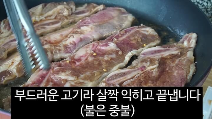 불은 중불로 해서 양념에 잰 la갈비를 올려줍니다. 국물은 따로 넣지 않아도 되는데 혹시 질긴 고기라면 양념국물을 넣고 익혀주기도 합니다.