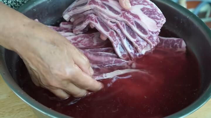 물에 천일염 1 숟갈 넣고 la갈비를 담가 핏물을 빼 주는데 갈비가 얇아서 오래 담가 두지 않고 뼛가루만 씻어내는 정도로 해줍니다. 갈비찜용 두꺼운 고기는 오래 담가서 핏물을 빼야 하지만 구이용의 얇은 갈비는 짧게 핏물을 빼 주어야 육즙이 빠져나가지 않고 맛있게 먹을 수 있습니다.
