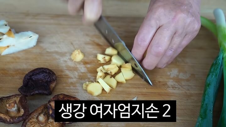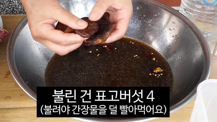 불린 건 표고버섯을 4개 넣어주는데 건표고버섯을 불린 후에 넣어야 간장물을 덜 빨아들입니다. 표고버섯을 넣어주면 더 맛있는 양념이 되는데 없으면 생략해도 좋습니다.