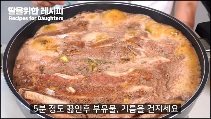 15분 정도 끓인 후 뚜껑을 열면 la갈비가 푹 잘익었고, 가운데에 기름이 많이 모이니 기름은 한번 더 걷어줍니다. 기름을 걷어내야 밥 비벼먹기가 좋습니다.