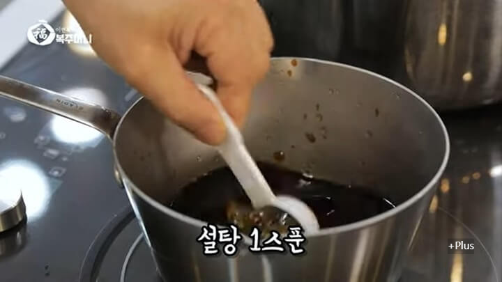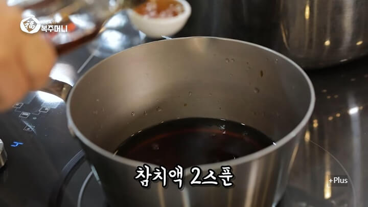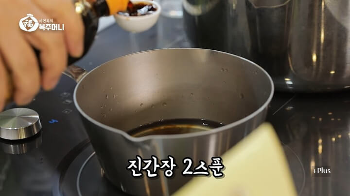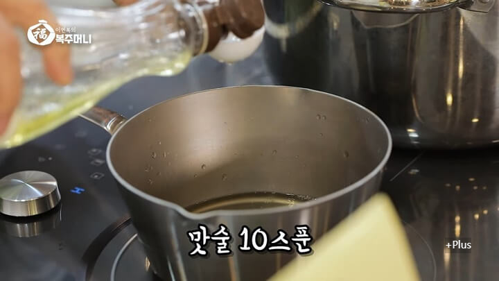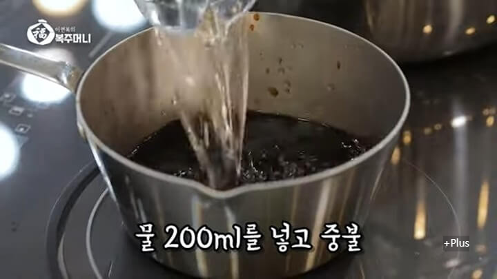 소스 냄비에 맛술 10스푼, 진간장 2스푼, 참치액젓 2스푼, 굴소스 2스푼, 설탕 1스푼, 물 200ml를 넣고 중불에서 끓입니다.