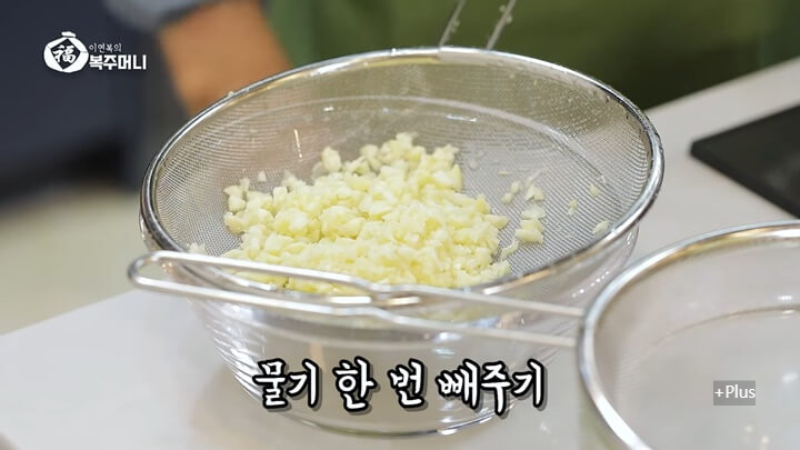 통마늘을 칼로 다져줍니다. 마늘 갯수는 가리비 개수의 두배로 준비하면 됩니다. 다진 마늘에서는 진액이 나오기 때문에 물에 한번 헹궈줍니다. 마늘 진액이 남으면 기름에 타기 쉽습니다. 물에 한번 헹군 마늘에 체에 밭쳐 물기를 빼 줍니다.