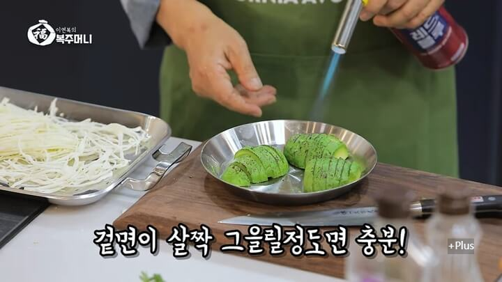 아보카도를 반으로 잘라 적당한 두께로 썰어준 다음 토치로 그을려줍니다. 불과 만나면 풍미가 훨씬 업그레이드 됩니다. 겉면이 살짝 그을릴 정도만 해 주면 됩니다.