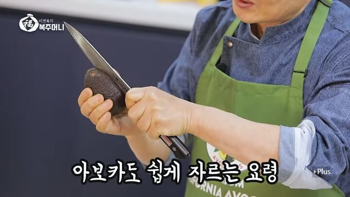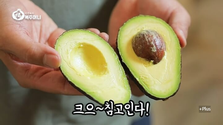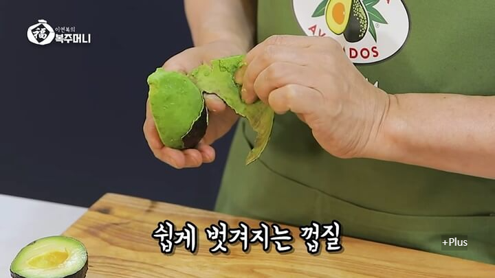 아보카도 손질법은 아보카도 옆선을 따라 칼집을 내준 다음 반으로 가릅니다. 잘 익은 아보카도는 손으로도 쉽게 껍질을 벗길 수 있습니다.