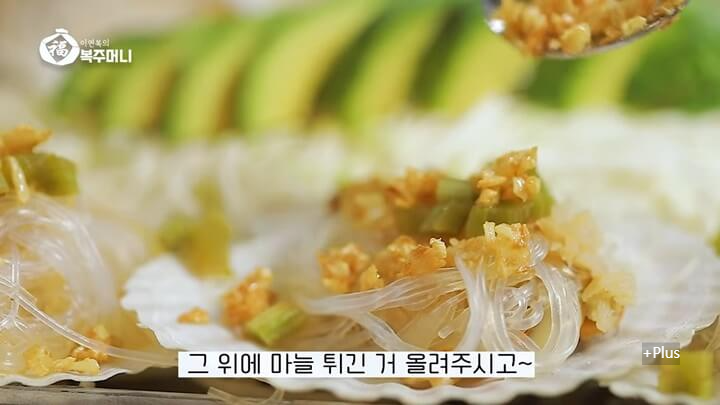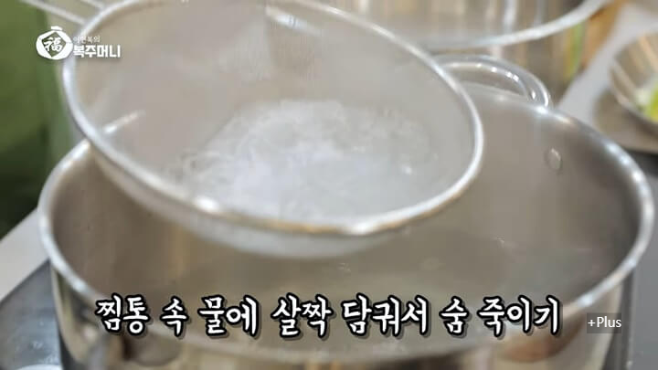 실 당면은 찬물에 두시간 불려두었다가 찜통 속 물에 살짝 담가서 숨을 죽여줍니다. 숨이 죽은 실 당면은 가리비 위에 올려 모양 잡기가 편합니다.
