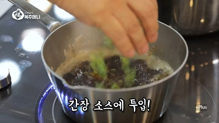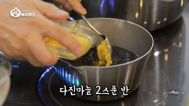 거른 간장은 다시 냄비에 붓고 다진마늘 2스푼 반을 넣어줍니다.