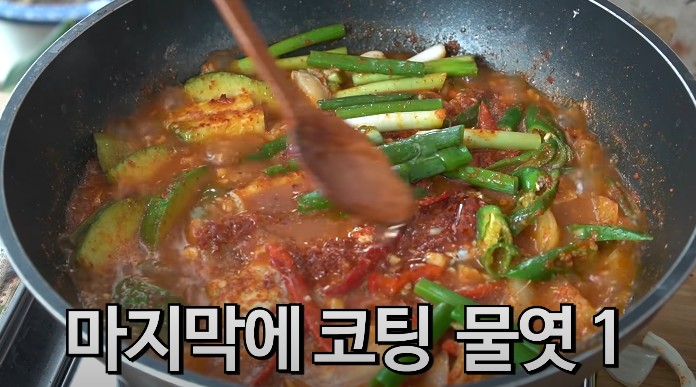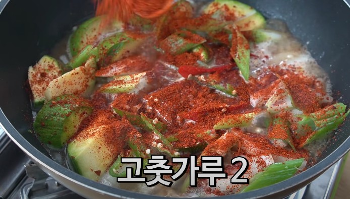 고추와 대파도 반만 미리 넣고 푹 익혀줍니다. 고춧가루 2숟갈을 위에 살살 흩뿌려주고 뚜껑을 닫은 후 바글바글 끓여줍니다.